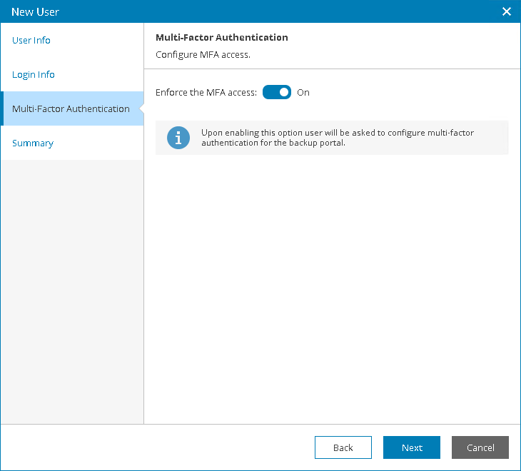 - At the Multi-Factor Authentication step of the wizard you can assign a second authentication factor to the created user. For details on MFA, see Configuring Multi-Factor Authentication.