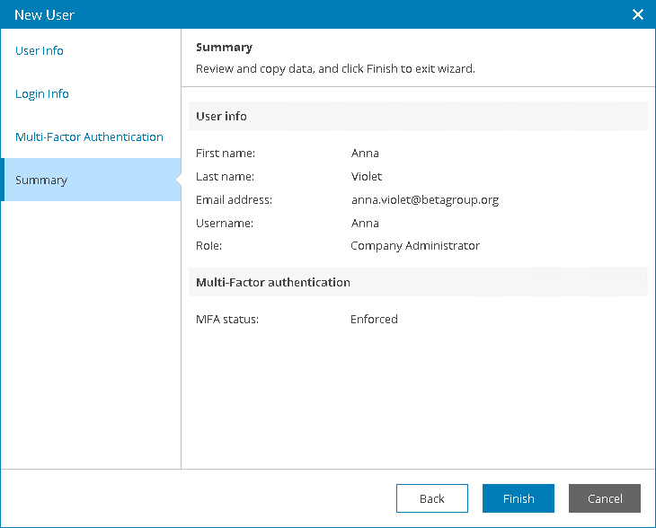 - At the Summary step of the wizard, review user details and click Finish.