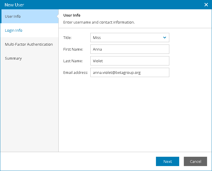 - At the User Info step of the wizard, specify user title, first name, last name, and email address.