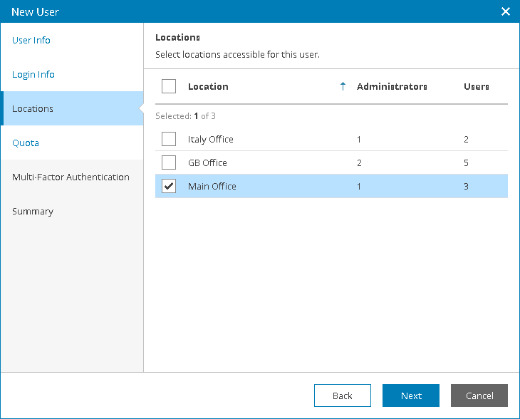 - At the Locations step of the wizard, select company locations whose data must be available for the user in the Client Portal.