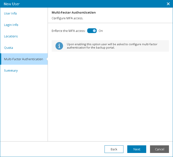 To enable MFA for the created user, set the Enforce the MFA access toggle to On. On the next authorization session, the user will be prompted to configure MFA.