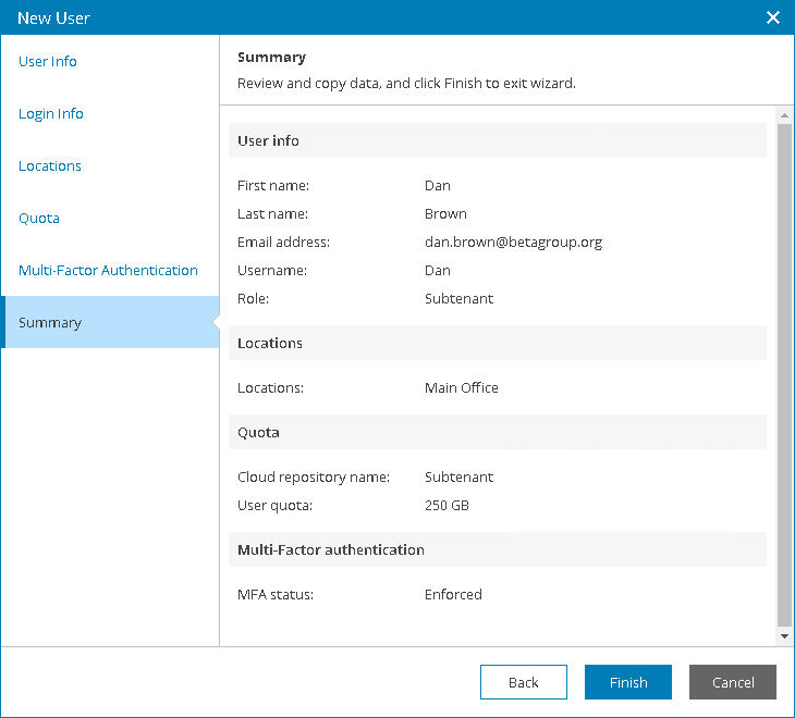 - At the Summary step of the wizard, review user details and click Finish.