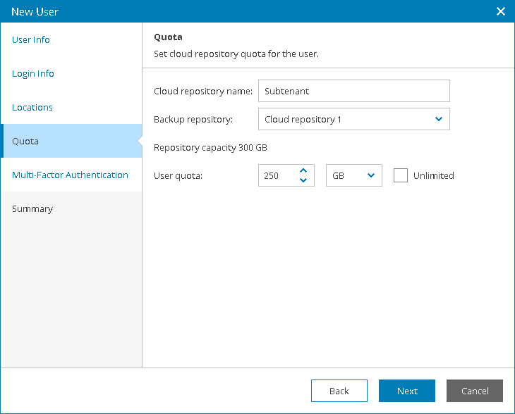 You can specify the size of the user quota or create an unlimited user quota. With an unlimited user quota, the Subtenant can consume all storage space within the company quota on a cloud repository.