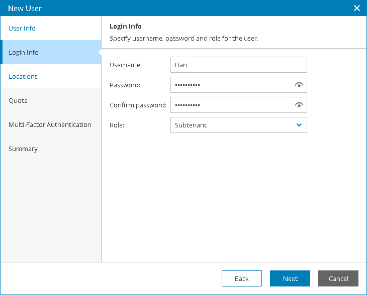 - At the Login Info step of the wizard, specify user credentials and choose a user role: