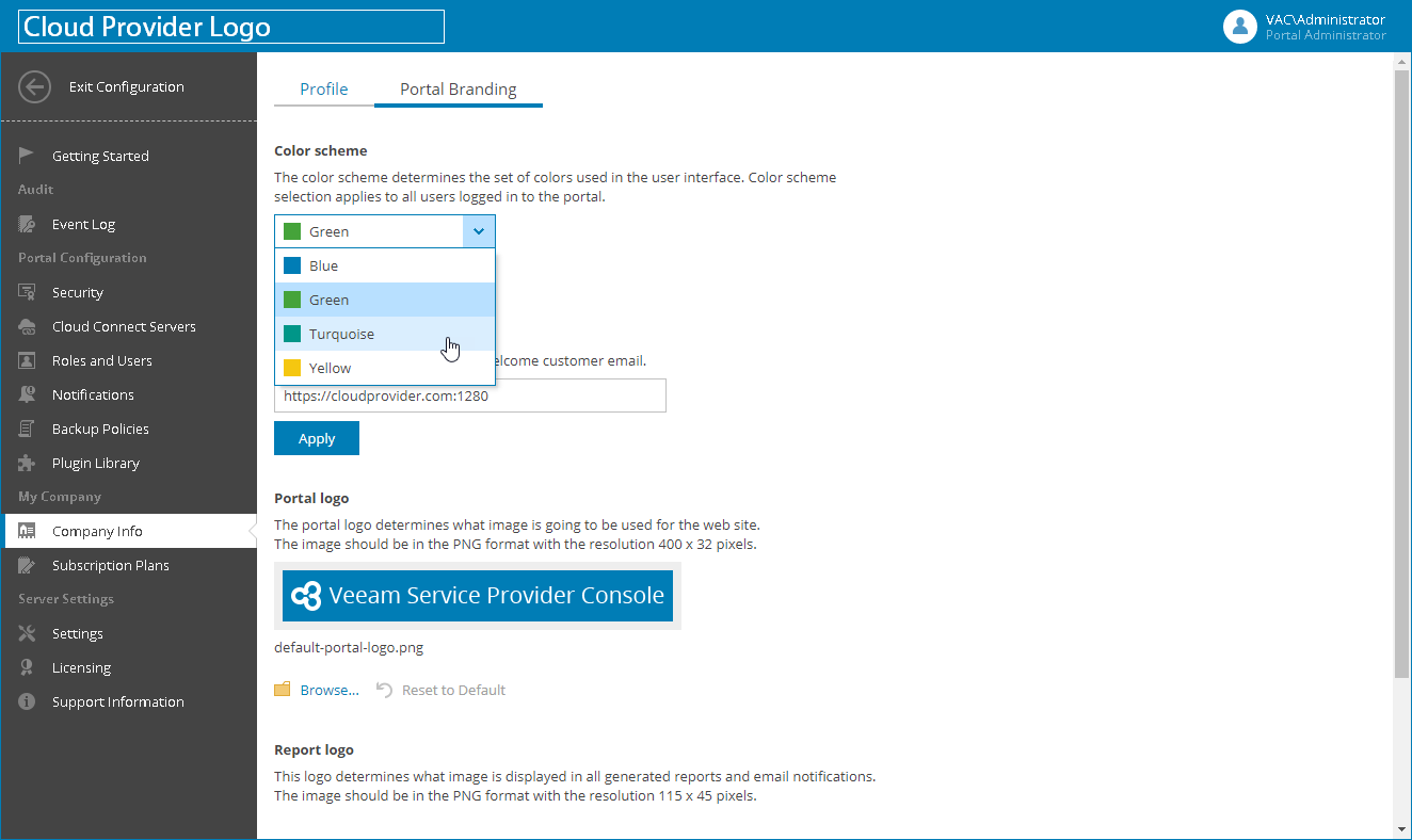 - In the Color scheme list, choose a set of colors that must be used in the Veeam Service Provider Console user interface: Blue, Green, Turquoise or Yellow. Click Apply.