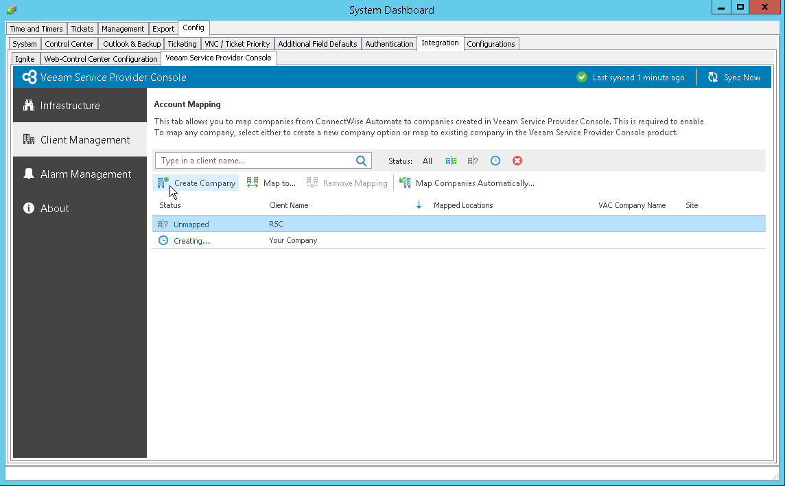 You can create companies in Veeam Service Provider Console based on contact data from accounts of clients managed in ConnectWise Automate.