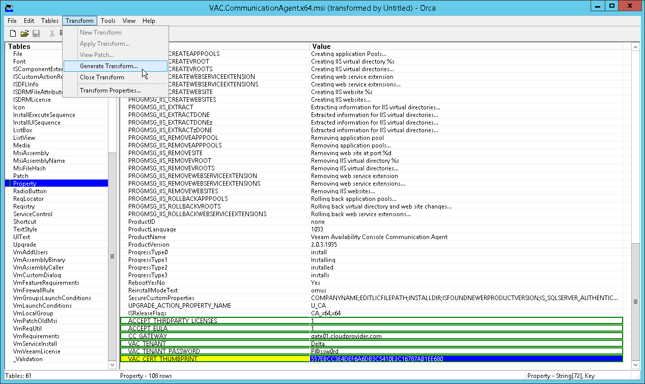 - VAC_CERT_THUMBPRINT — thumbprint of a certificate that is installed on the Veeam Service Provider Console server, and used to secure traffic between the service provider and clients.