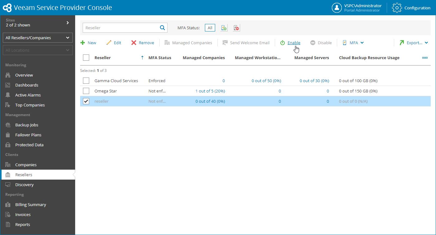 You can disable and enable resellers to control availability of cloud resources, and functionality available to companies in Veeam Service Provider Console.