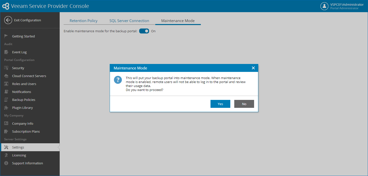 When you perform crucial configuration changes to the Veeam Service Provider Console portal, you might need to put the portal to the maintenance mode.
