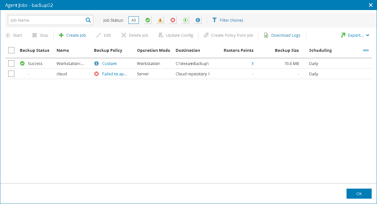 You can view Veeam backup agent job details and export them to a CSV or XML file.