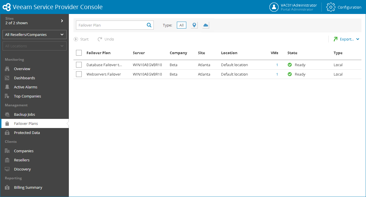 Veeam Service Provider Console will display a list of all failover plans configured on managed backup servers.