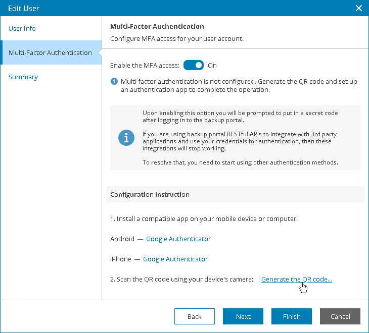 - Set the Enable the MFA access toggle to On and click the Generate the QR code link.