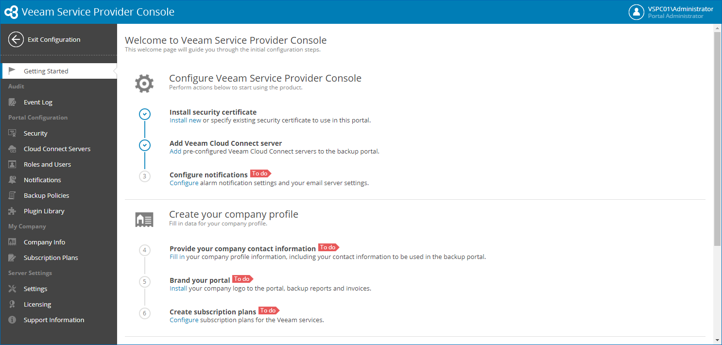 You can get a prompt about required configuration steps in Veeam Service Provider Console. Log in to Veeam Service Provider Console as a Portal Administrator, at the top right corner of the Veeam Service Provider Console window, click Configuration and choose Getting Started. The welcome dashboard will display information about tasks that you must perform to configure Veeam Service Provider Console.