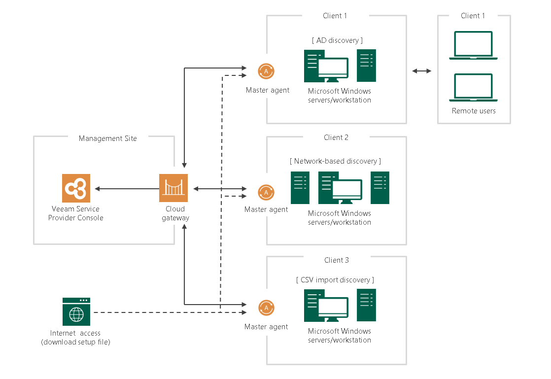 For installation with discovery rules, Veeam Service Provider Console requires a master agent. A master agent is a Veeam Service Provider Console management agent that runs on a Windows machine in the client infrastructure. This agent is responsible for performing various types of tasks during the discovery and installation procedures, such as collecting information about discovered computers, installing Veeam Service Provider Console management agents on client computers, downloading the Veeam backup agent setup file, uploading it to client computers, and so on.