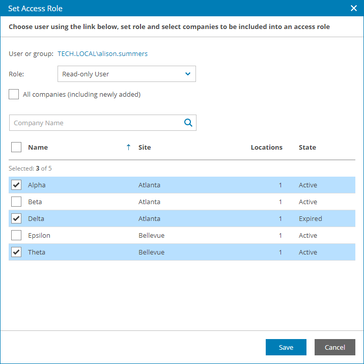 If you logged in to Veeam Service Provider Console as a Site Administrator, you can assign to Read-only Users only companies registered on your Veeam Cloud Connect site.