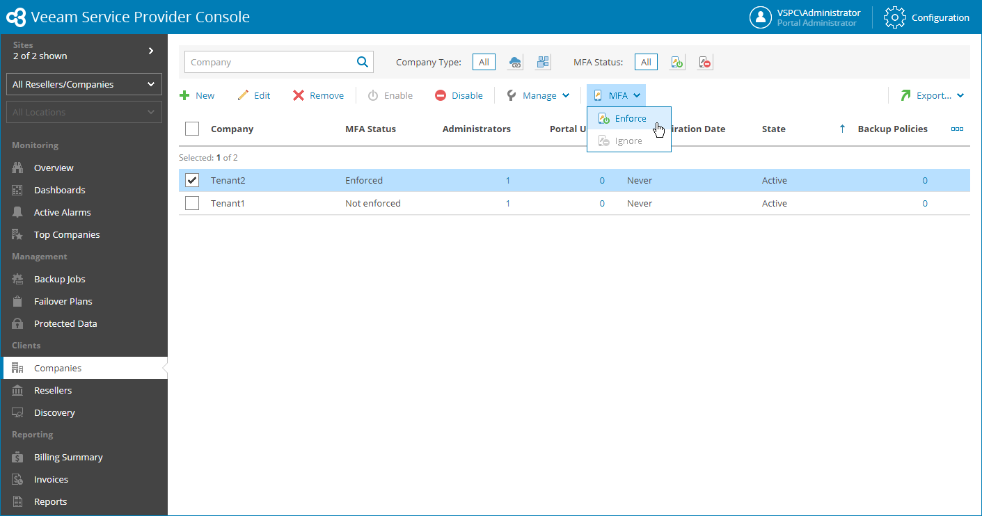 If the Enforce MFA for all managed clients and resellers policy is enabled or MFA is enabled for the reseller that manages the selected companies, you cannot disable MFA. For details, see MFA Policies. |