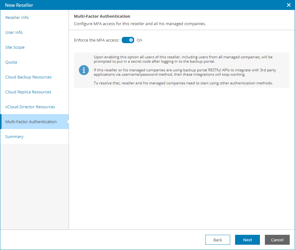 At the Multi-Factor Authentication step of the wizard you can assign a second authentication factor to all reseller users and users of all assigned companies. For details on MFA, see Configuring Multi-Factor Authentication.