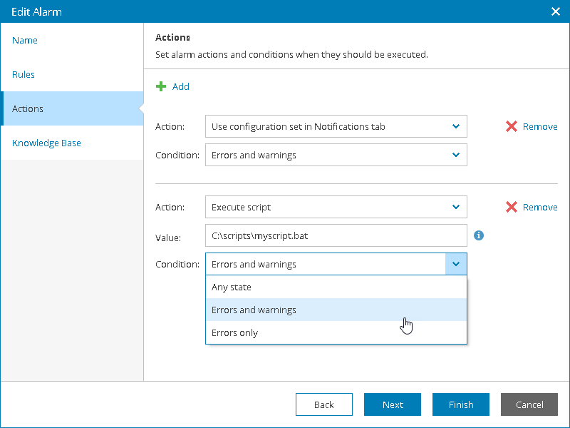 - Errors and warnings — select this option if the script must run every time when the alarm status changes to Error or Warning, or when a new alarm with one of these statuses is triggered.