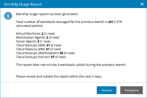 Starting from the first day of the month (and up to, and including the tenth day of the month), when you access Veeam Service Provider Console as a Portal Administrator, the product will notify you that a license usage report was generated.