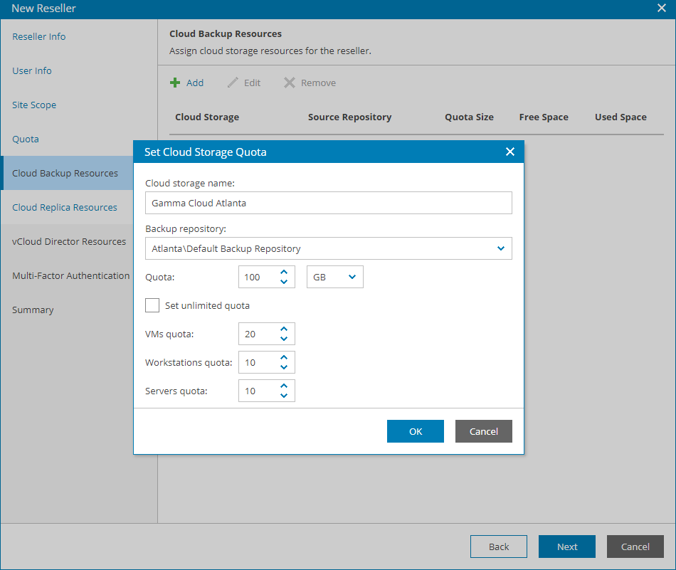 At the Cloud Backup Resources step of the wizard, you can allocate cloud repository resources to a reseller. A reseller to which cloud repository resources are allocated will be able to store in the cloud client backups created with Veeam Backup & Replication and Veeam backup agents.