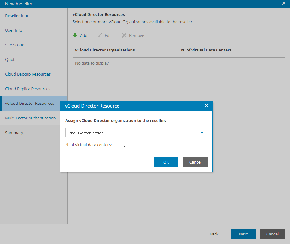 - Repeat steps 1–3 for all vCloud Director organizations which you want to allocate to the reseller.