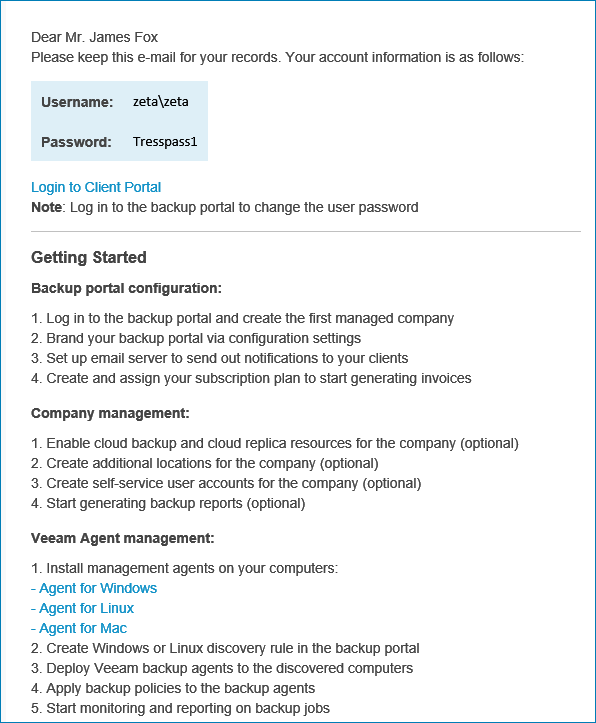 You can create custom templates for welcome email messages sent to resellers. For details, see this Veeam KB article. |
