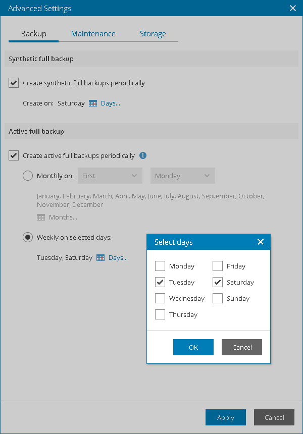 - If you want to periodically create synthetic full backups, select the Create synthetic full backups periodically check box and click Days to schedule synthetic full backups on the necessary week days.