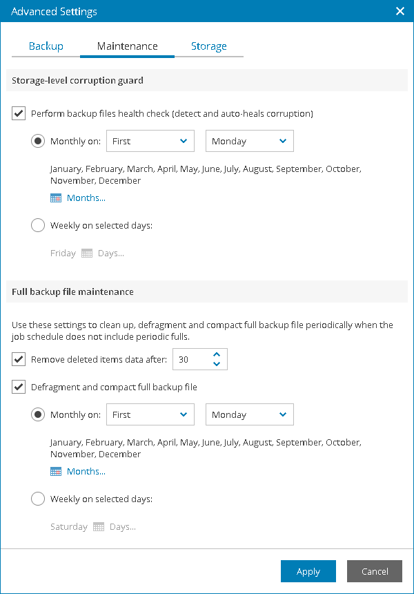 On the Maintenance tab of the Advanced Settings window, specify maintenance settings for the backup chain created with the backup job: