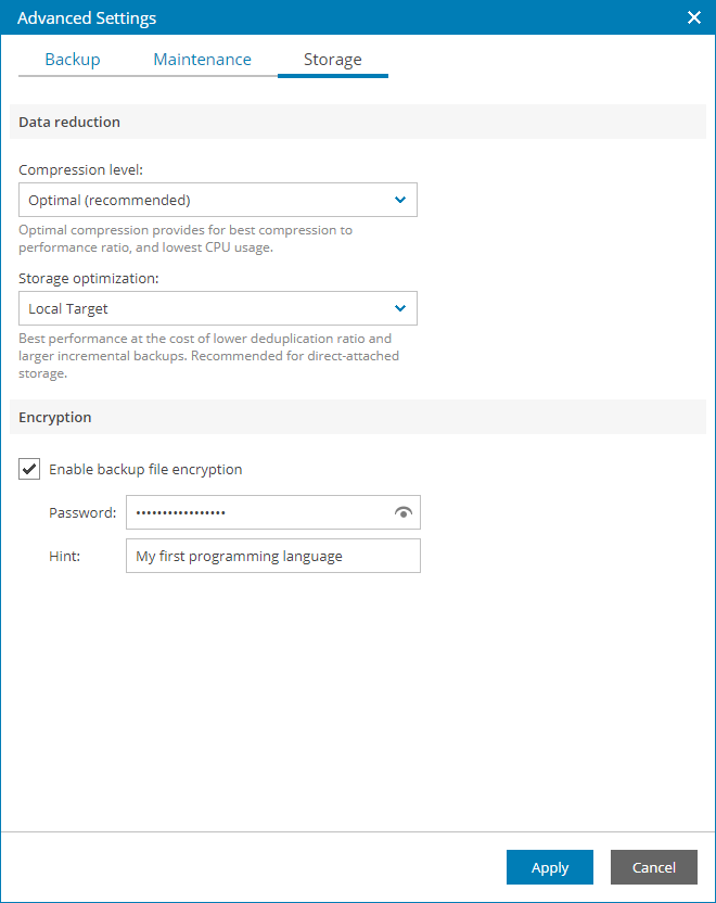 On the Storage tab of the Advanced Settings window, specify storage settings for the backup job: