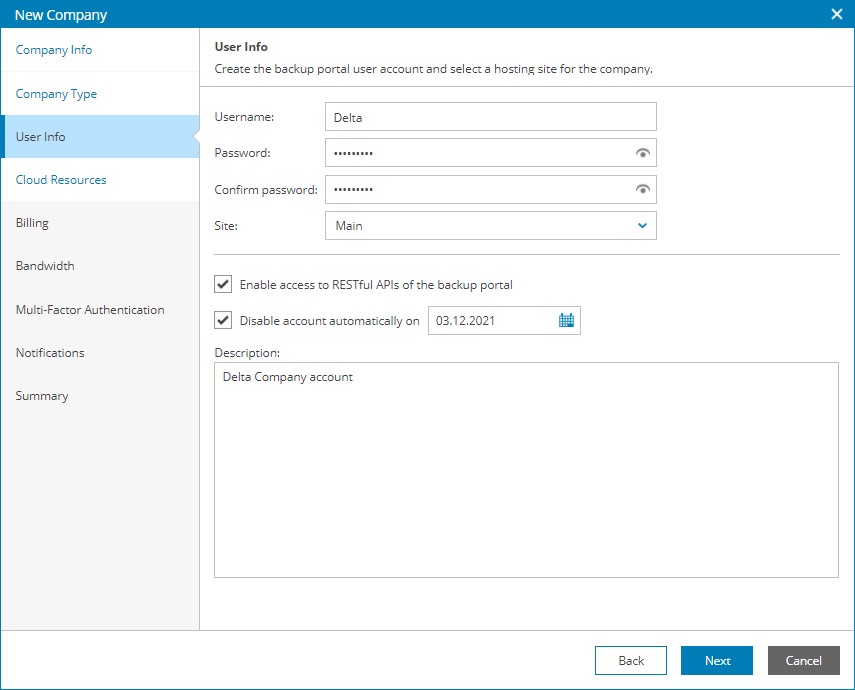 - To limit the period during which the company can access allocated Veeam Cloud Connect resources, select the Disable account automatically on check box and specify a date when the lease period must terminate.