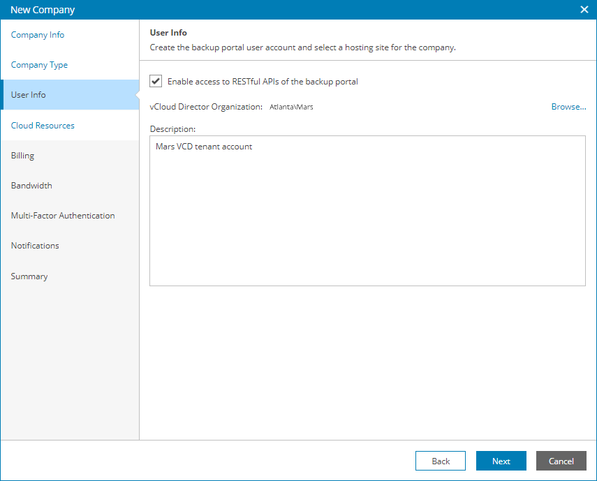 - To allow company users to access Veeam Service Provider Console RESTful API, select the Enable access to RESTful APIs of the backup portal check box.