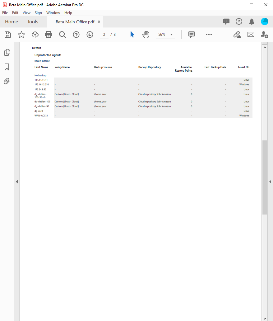 - The Protected Agents subsection displays a list of client computers that have at least one restore point that meets RPO requirements specified in the report configuration. Information on protected computers in each company location is grouped by Veeam backup agent or backup policy, as configured in the report parameters.