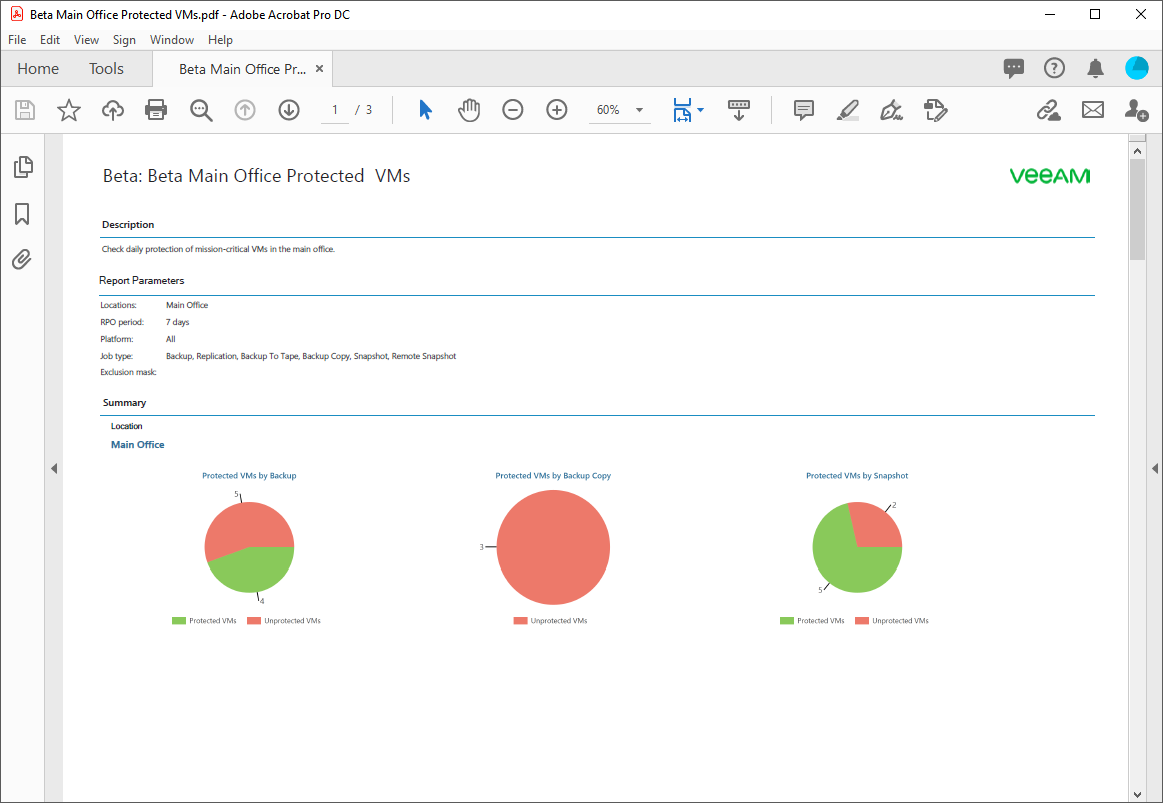 - The report charts display information about protected and unprotected computers, the type and platform of computers protected with Veeam backup agents, the latest backup status of each job on protected computers, and reasons for a failure to meet RPO requirements.