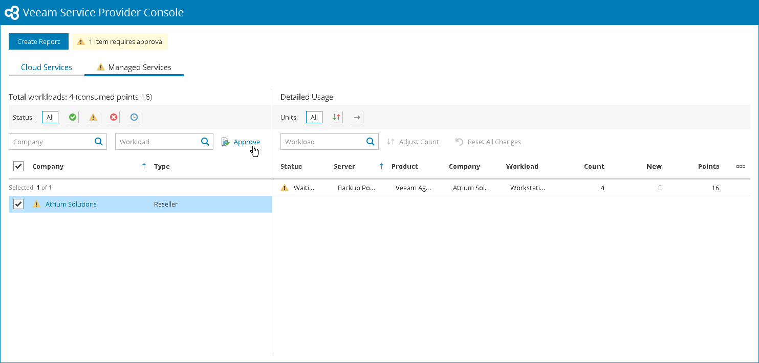 - On the license approval webpage, open the Managed Services tab and select the reseller in the left part of the page.