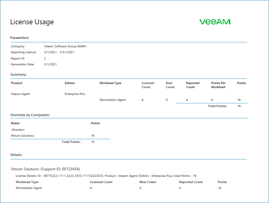 The Details section contains information about number of activated agents and consumed license units for each client company.