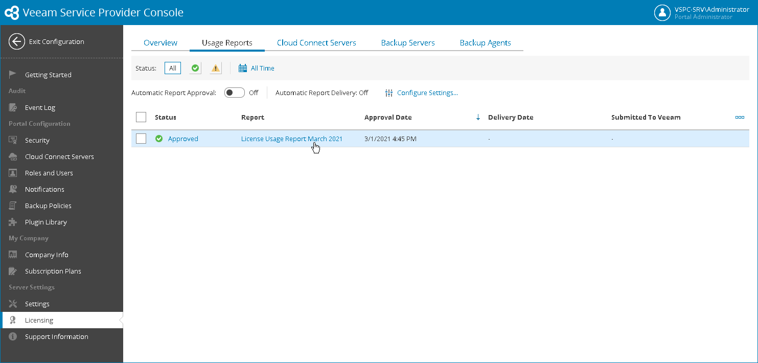 Veeam Service Provider Console allows you to monitor the number of license instances consumed by reseller clients. Every month Veeam Service Provider Console generates license usage reports that includes agents that were activated during the previous month. Agent is automatically activated the next month from discovery which means that it appears in the report generated for the month after next. To perform this step of the scenario, you will set date on the machine that runs Veeam Service Provider Console to 2 months from the day when you connected agent workstations and Veeam Backup & Replication server for previous scenarios. For example, if you finished discovering agents on January 15th, change the date to March 15th.
