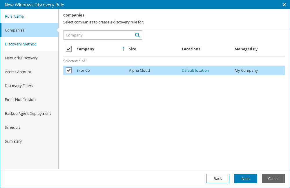 - At the Companies step of the wizard, choose the company that you created at the Register Account for Managed Company step.