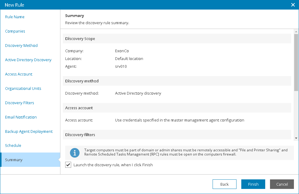 - At the Summary step of the wizard, select Launch the discovery rule when I click Finish.