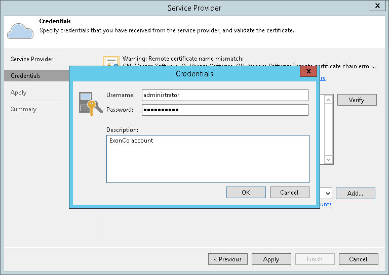 - At the Credentials steps of the wizard, click Add and provide user credentials of a Company Owner account.