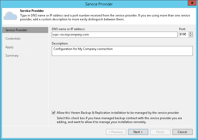 - Select the Allow this Veeam Backup & Replication installation to be managed by the service provider check box.