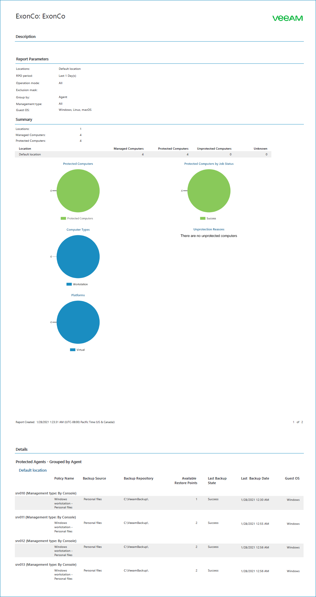 - Open the downloaded document and check the report results: the number and type of protected computers, latest backup status and reasons for backup job failure, if any, the list of protected and unprotected computers.