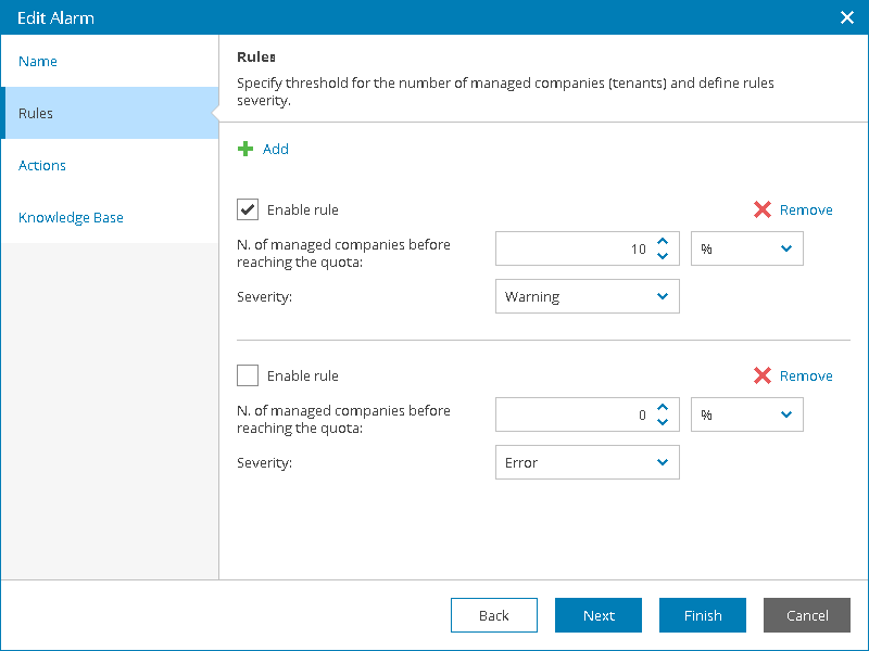 Veeam Service Provider Console comes with a set of predefined alarms that you can modify to fit your needs. For this scenario, you will edit the Reseller managed companies quota alarm to stop receiving notifications about reseller reaching maximum number of managed companies.