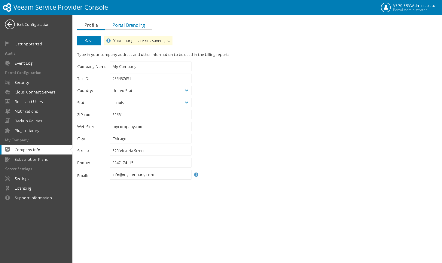 In the Company Info form, provide information about your company, that is, the company that provides managed backup services. This information makes up your company profile, and will be displayed in invoices and email notifications. Before you move to the next step, make sure to click Save to save changes made to the profile information