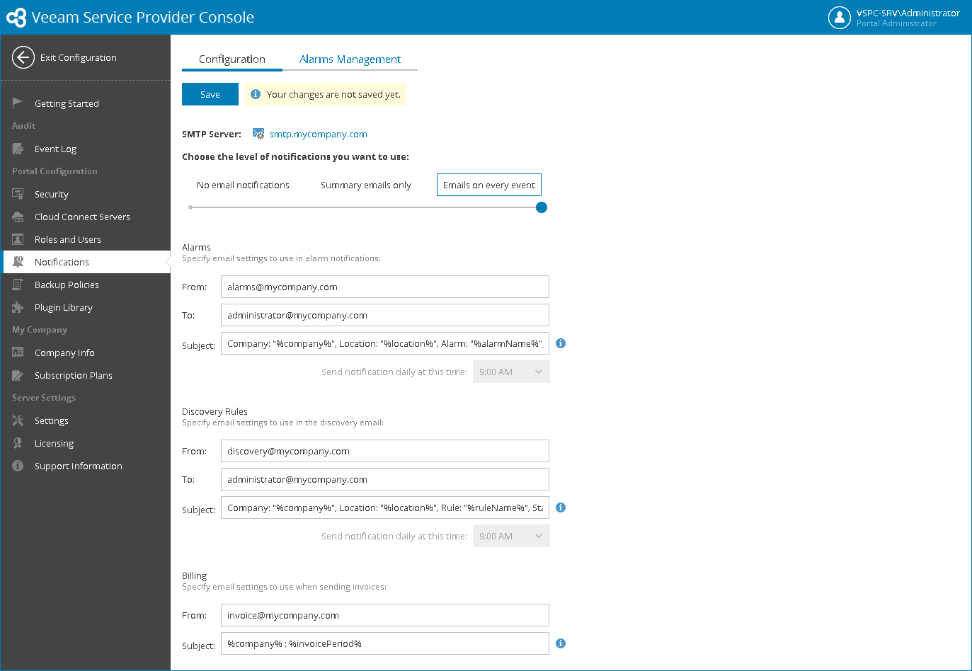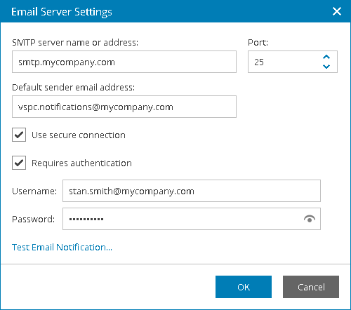 Specify email notification settings that Veeam Service Provider Console will use to send all types of email messages, including welcome email message, billing notifications, alarm notifications.