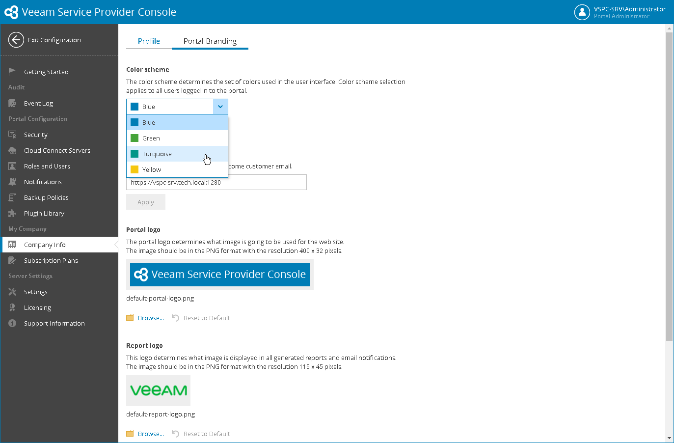 - In the Portal logo section, click Browse and specify a path to the image that must displayed at the top left corner of the Veeam Service Provider Console window.