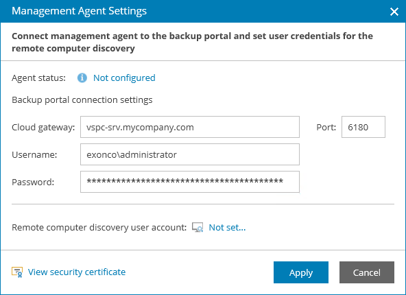 - In the Management Agent Settings window, specify settings that the agent must use to connect to Veeam Service Provider Console.