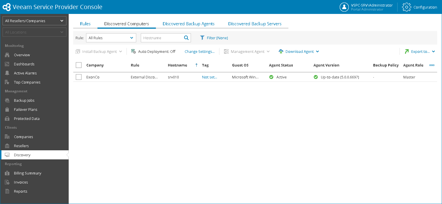 To perform discovery of client computers, you must install and configure a Veeam Service Provider Console master agent on a Microsoft Windows machine in the client infrastructure. The master agent is responsible for performing various types of tasks during the discovery and installation procedures, such as collecting information about discovered computers, installing Veeam Service Provider Console management agents on client computers, downloading the Veeam backup agent setup file and uploading it to client computers, and so on.