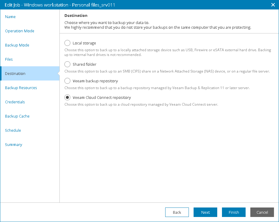 - At the Destination step of the wizard, select Veeam Cloud Connect repository.