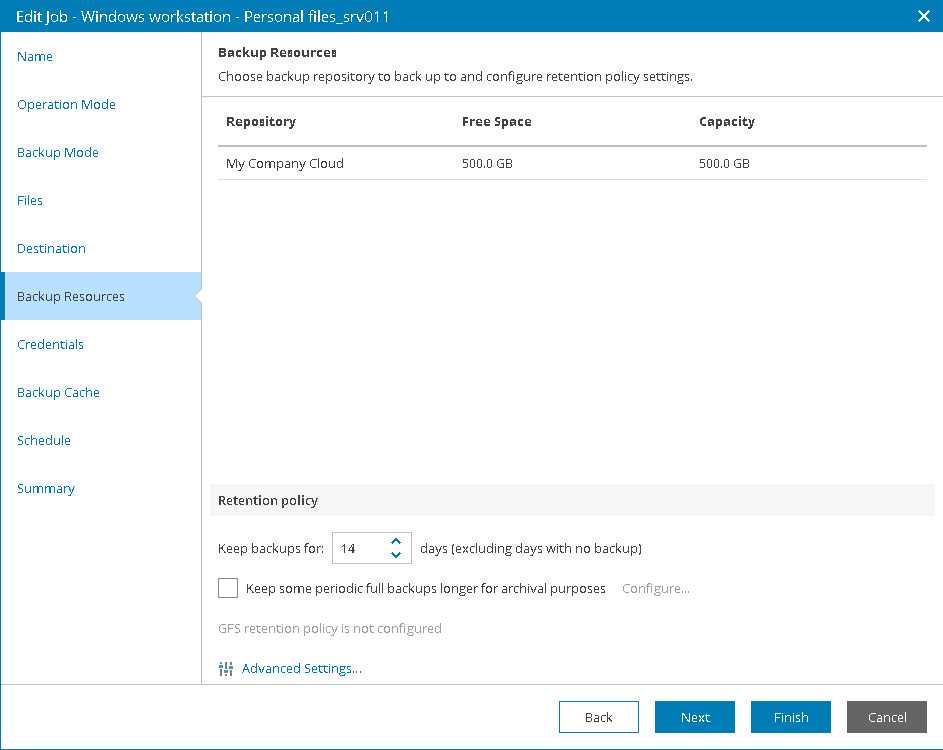 - At the Backup Resources step of the wizard, select a cloud repository that you configured at the Allocate Cloud Repository Resources step, and specify how many backup restore points you want to keep in the cloud.