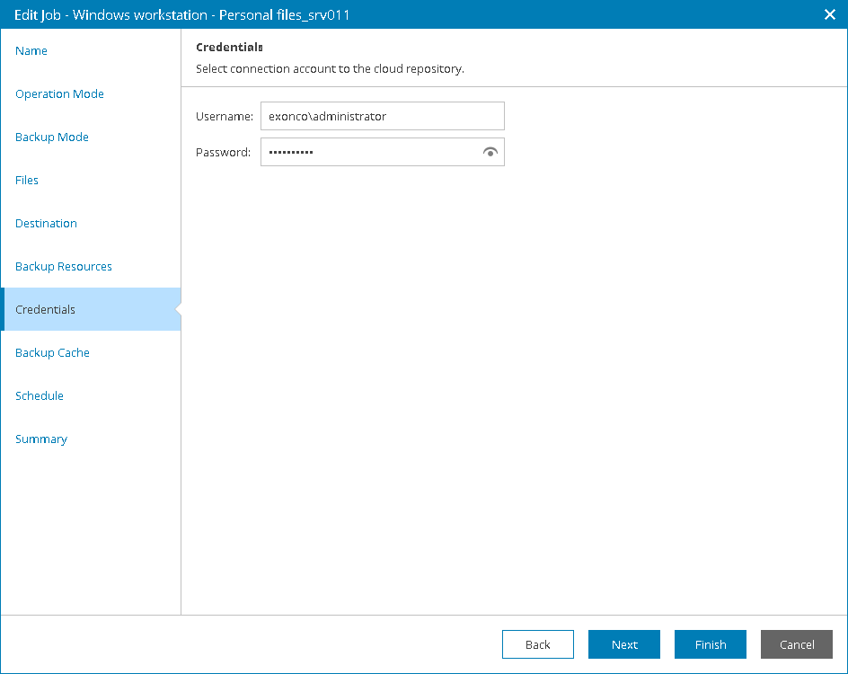 - At the Credentials step of the wizard, specify credentials that will be used to connect to the cloud server. These must be the credentials you specified while registering the company account.